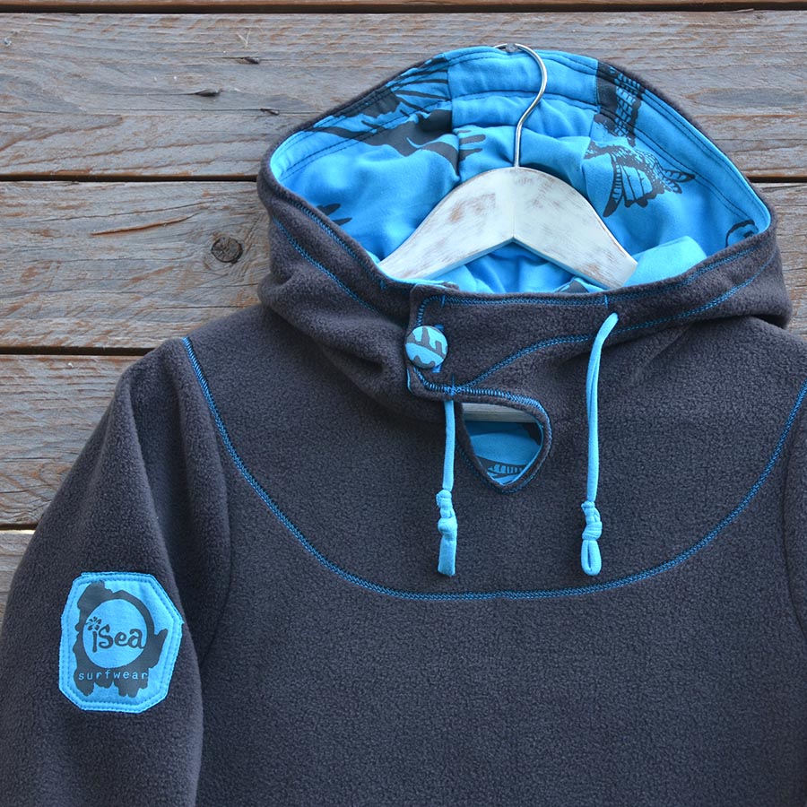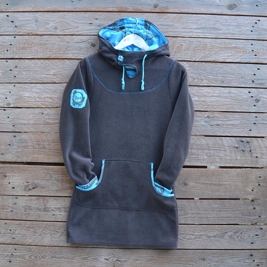 This longer length hoody dress is in dark grey fleece with turquoise jersey lining and trims. The jersey has been screen printed with large eagles design in dark grey ink.